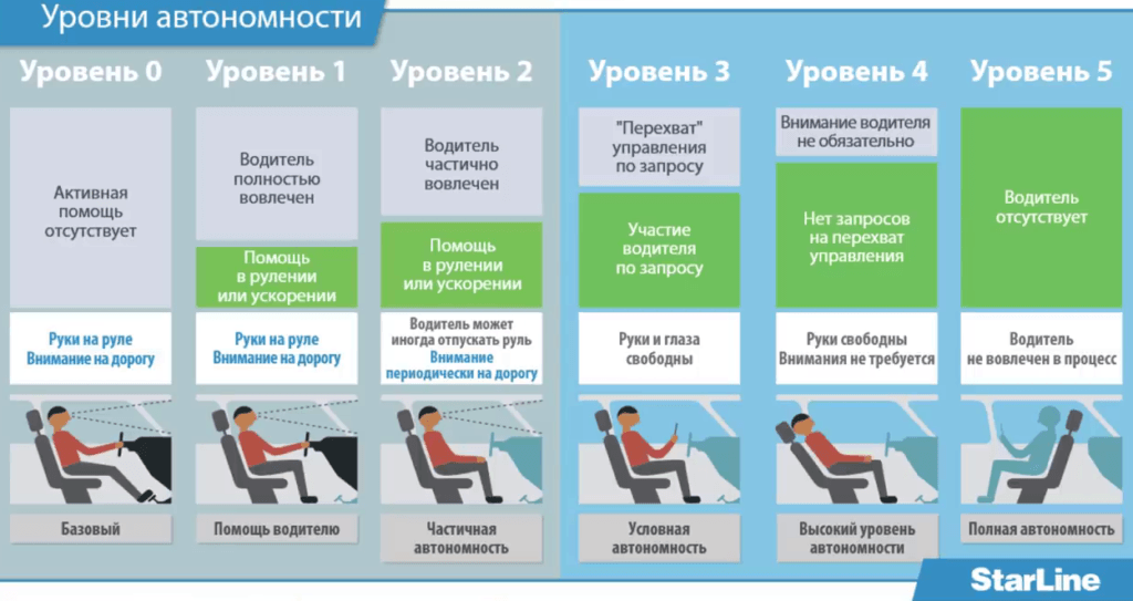 В зависимости от того, что машина умеет делать сама, инженеры разделили автопилот на 6 уровней: