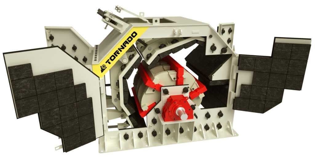 Роторные дробилки Tornado спроектированы в качестве альтернативы последовательному дроблению на конусных дробилках среднего и мелкого дробления. В первой камере происходит дробление наиболее крупных фрагментов породы – аналог дробилки КСД. Во второй и третьей камерах продолжается дробление и упрочнение, материал доводится до крупности 0-40 мм. Вторая и третья камеры – альтернатива дроблению на дробилке КМД.