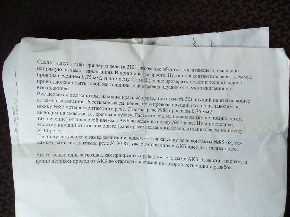 С тех пор не было никаких предположений, что не менялось (провода взрывчатки, втягивающее устройство стартера, выключатель), кроме этого были очищены все места крепления минуса к кузову. Ничего не помогло. Думал гадал, долго советовался: что делать? Тут я задал вопрос, мне порекомендовали разные вещи, и вот мы с другом решили установить на стартер дополнительное реле. Может, это поможет!