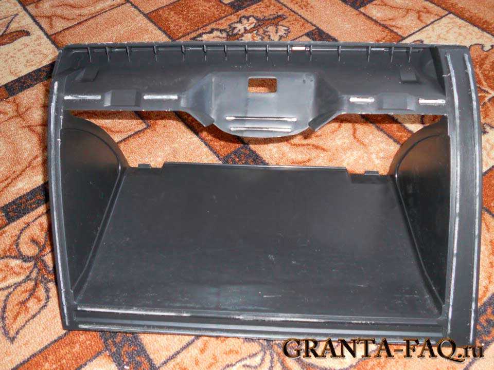 Бардачок нужно снять с автомобиля, для этого нужно его открыть и по краям крышки поджать упоры, бардачок упадет еще ниже и далее, с некой силой дернув его с держателей, демонтировать. Более подробно в статье: «Снятие бардачка на Лада Гранта«.