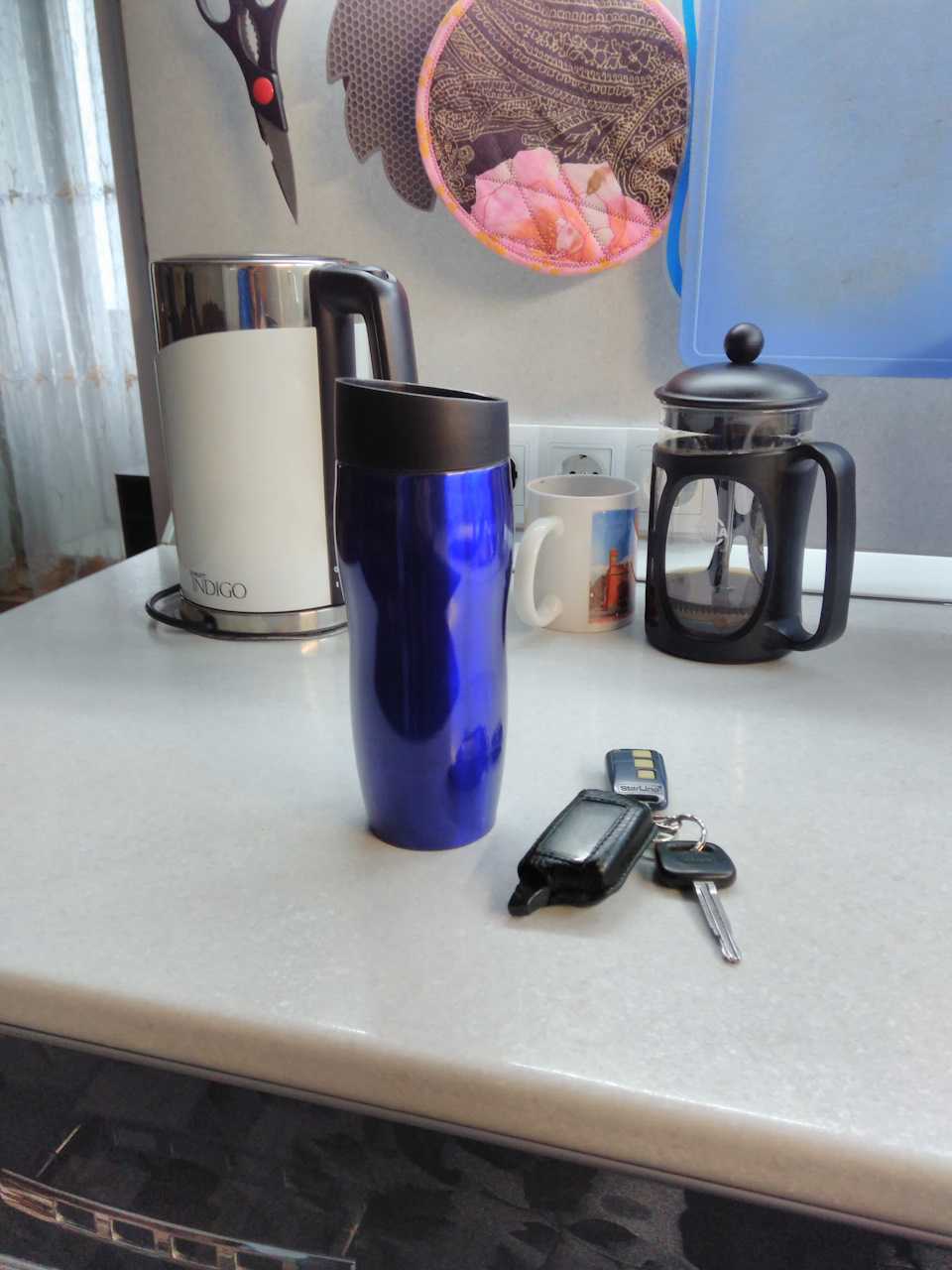 Ещё на новый год, супруга подарила мне (по моему заказу*), кружку термос в машину.