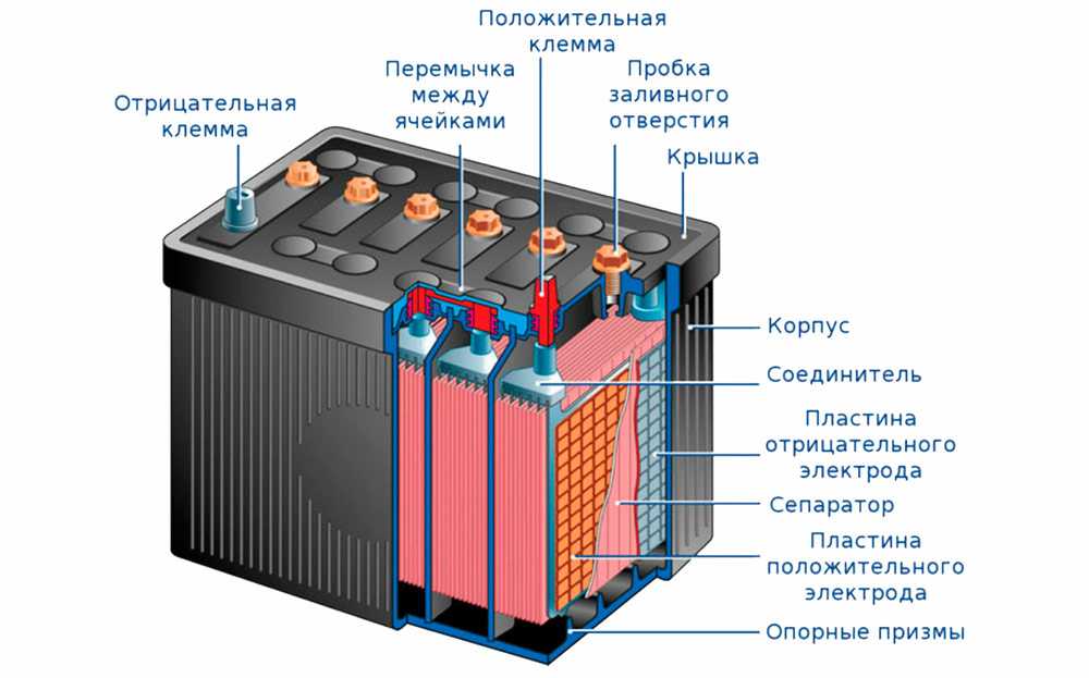 Классический аккумулятор основан на свинцовых пластинах и электролитной смеси, состоящей из дистиллированной воды и серной кислоты. Батарея состоит из шести секций. Они называются банками. Каждый банк содержит пару пластин с разной полярностью. Контакты встроены в общий коллектор и соединены последовательно. Две клеммы установлены на крышке корпуса.