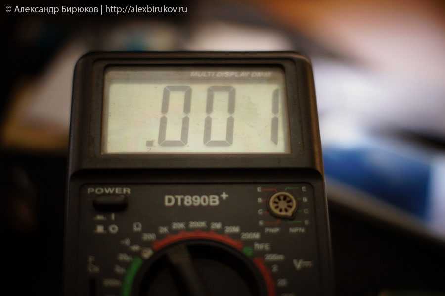 Для прозвонки можно использовать простой измерительный прибор, например, DT-830B. В первую очередь необходимо установить переключатель измерений в режим проверки минимального сопротивления — 200 Ом, после чего соединить щупы между собой. Индикатор прибора при соединённых щупах должен показывать минимальное значение R, которое стремится к нулю, например, 0,03 Ома. После так называемой калибровки можно приступить к измерениям.