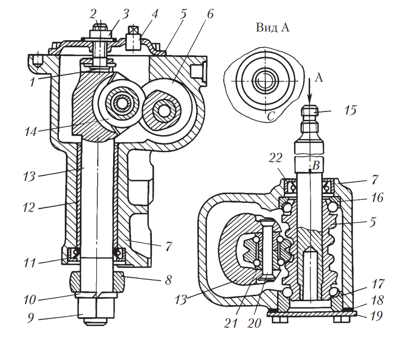 Рис. 12. Схема рулевого механизма типа червяк-ролик: 1 — пластина регулировочного винта вала сошки; 2 — регулировочный винт; 3 — контргайка; 4 — пробка; 5 — крышка картера рулевого механизма; 6 — червяк; 7 — картер рулевого механизма; 8 — сошка; 9 — гайка крепления сошки; 10 — пружинная шайба; 11 — сальник вала сошки; 12 — втулка; 13 — вал сошки; 14 — ролик вала сошки; 15 — вал червяка; 16, 17 — подшипники червяка; 18 — регулировочные прокладки; 19 — нижняя крышка картера; 20 — ось ролика; 21 — подшипник ролика; 22 — сальник вала червяка; В, С — метки