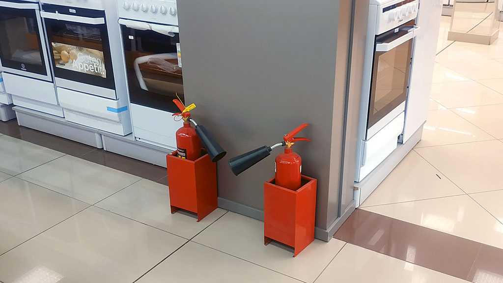 Конструкция подставки, зачастую мало чем внешне отличается кронштейна, рассчитана обычно под установку одного огнетушителя.