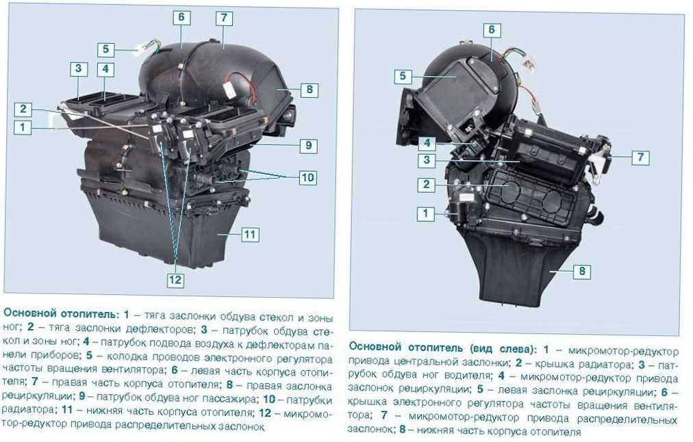 Если в предыдущих версиях отопителей использовались тросики для регулировки положения заслонок, то теперь эту функцию выполняют моторедукторы. Электровентилятор расположен в нижней части конструкции и для того, чтоб до него добраться, необходимо разобрать весь отопитель. По этой причине даже тот аспект, что двигатель в отопителе импортного производства, не компенсирует общего недостатка с размещением вентилятора.