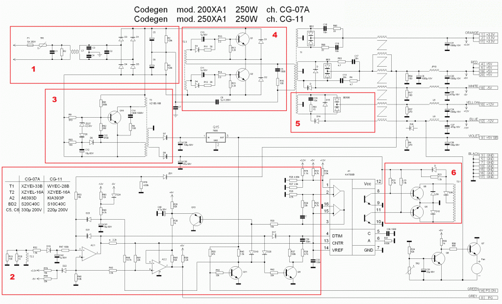 В основу работы LC-250ATX положен принцип ШИМ, реализованный на стандартной для таких схем микросхеме TL494. Она формирует импульсы, которые усиливаются ключами на транзисторах Q6,Q7, далее через трансформатор T2 ключами на транзисторах Q1, Q2 создаются импульсы на первичной обмотке трансформатора T1. Эти импульсы трансформируются через вторичные обмотки и подаются на выпрямители различных напряжений, из которых для переделки интересен лишь канал +12 вольт.