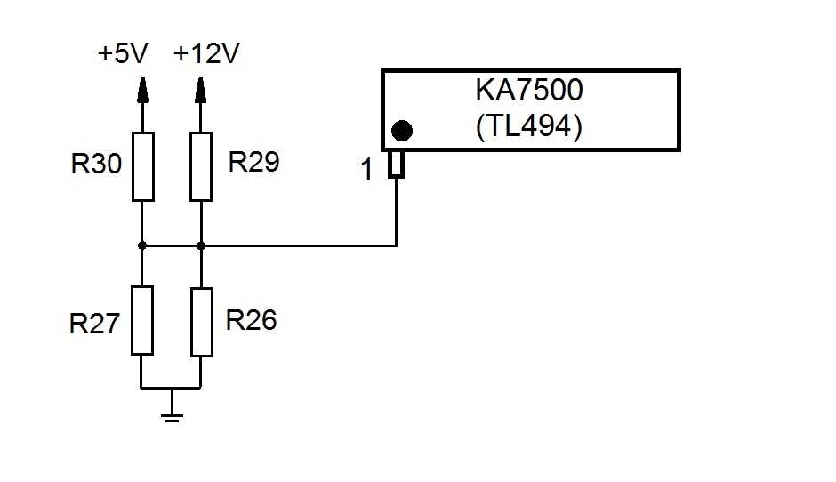 Также следует обратить внимание, что в БП могут быть установлены аналоги микросхемы TL494, такие как например: KA7500, MB3759, но схема включения у них аналогичная оригиналу. Теперь нужно найти постоянный резистор установленный в цепи первого вывода микросхемы и идущий на контакт +5v (это там, где раннее находились провода красного цвета) и убираем его тоже