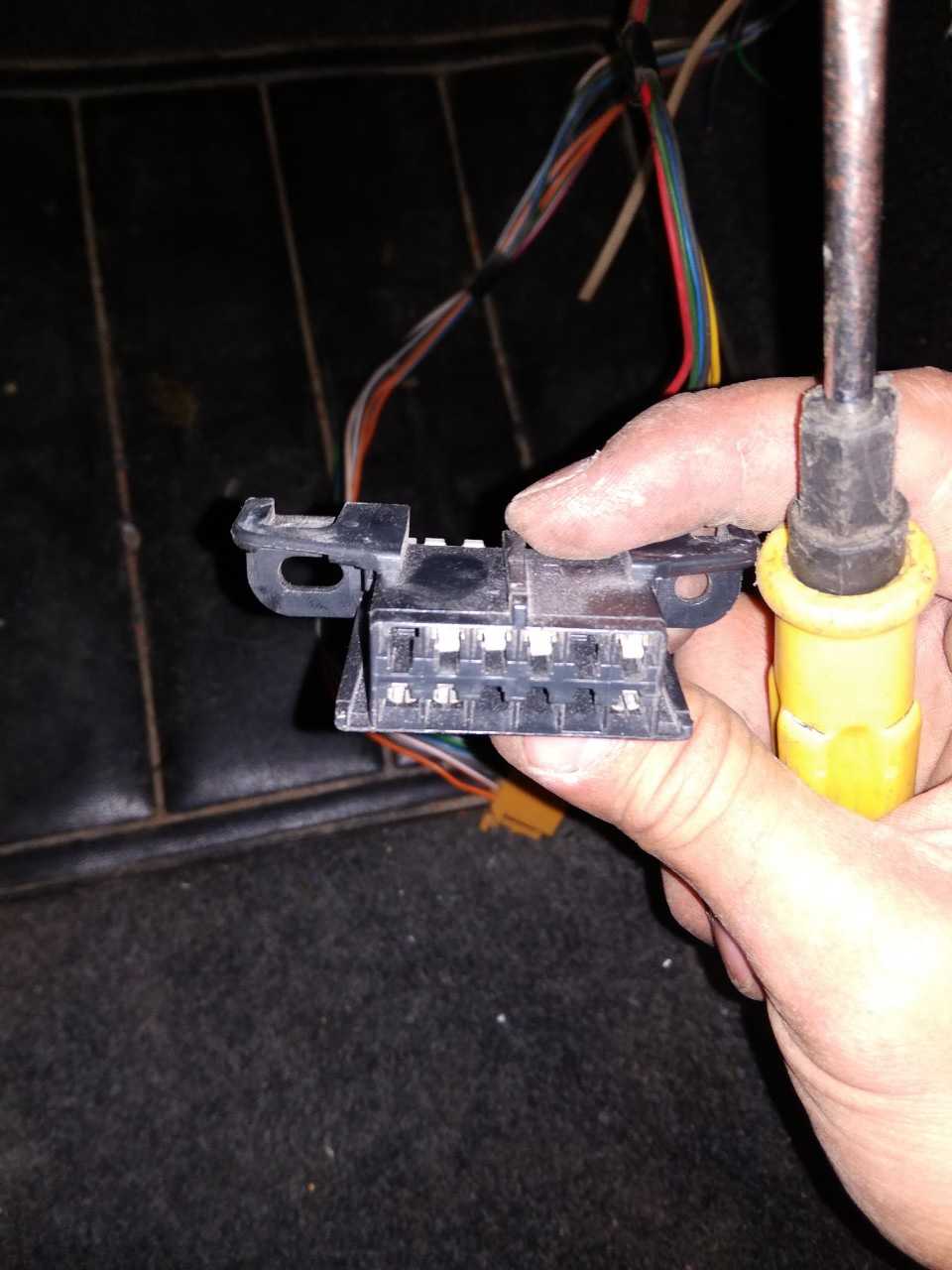 - На задней части имеются точки крепления для заводского коммутационного жгута, оснащенного разъемами ISO. Необходимо отсоединить штекеры от ящика, который затем откладывается в сторону.