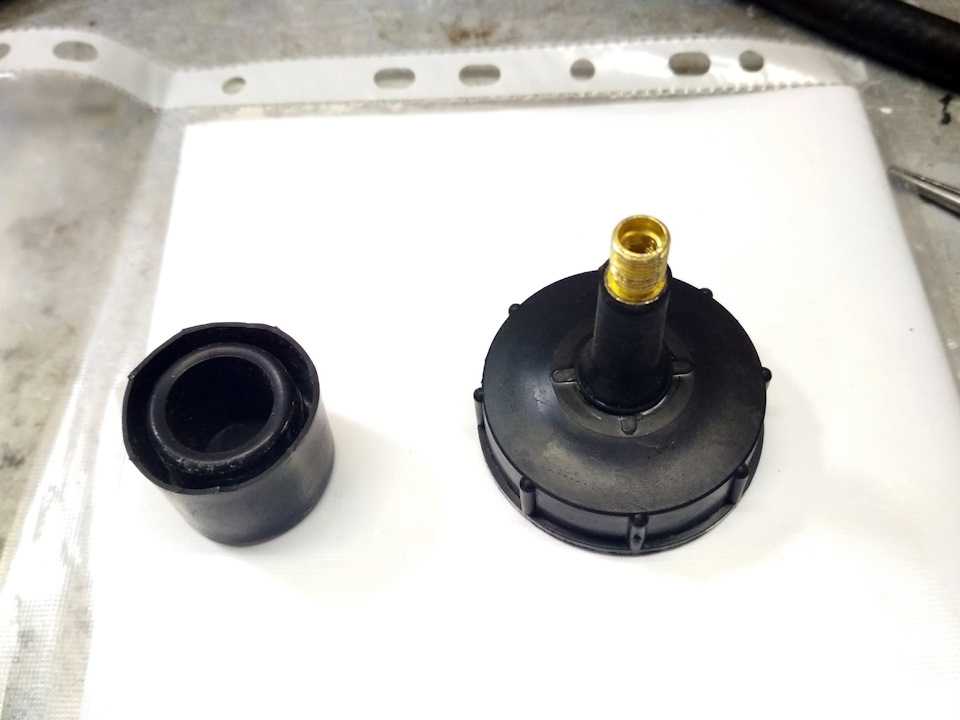 Прокачаем сами, но для этого нужно запастись крышкой от тормозного бачка старого образца, без указателя уровня жидкости. Ещё понадобится обычный ниппель от автомобильной камеры и сверло на 14. Высверливаем в центре крышки отверстие, вставляем ниппель. Приспособление готово. Переходим к прокачке: