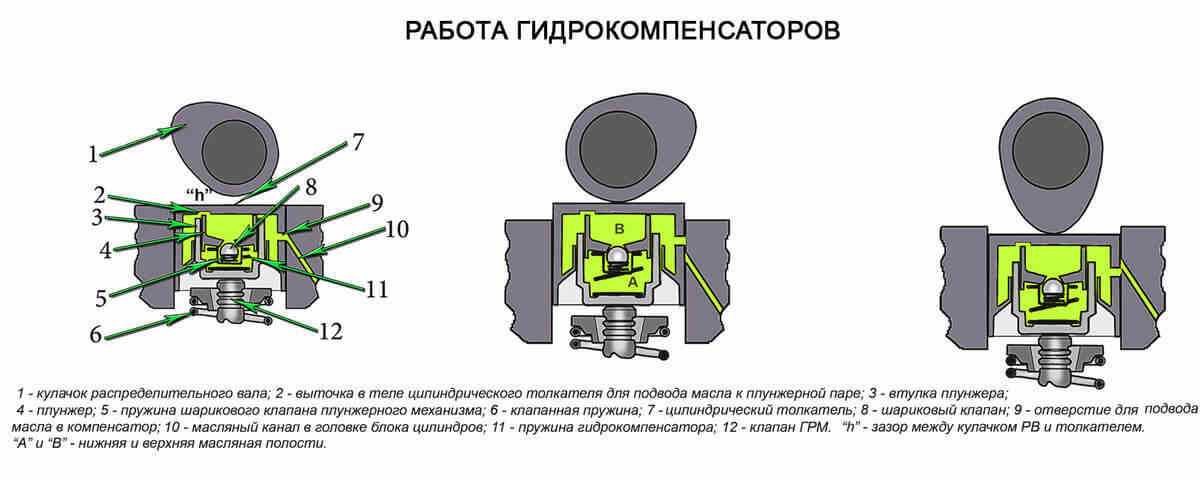 Гидравлический компенсатор будет бесшумно выполнять свою функцию, если обеспечены должные уровень, качество и давление смазки. В ином случае будут стуки. Время их проявления свидетельствует о неисправностях различного происхождения.