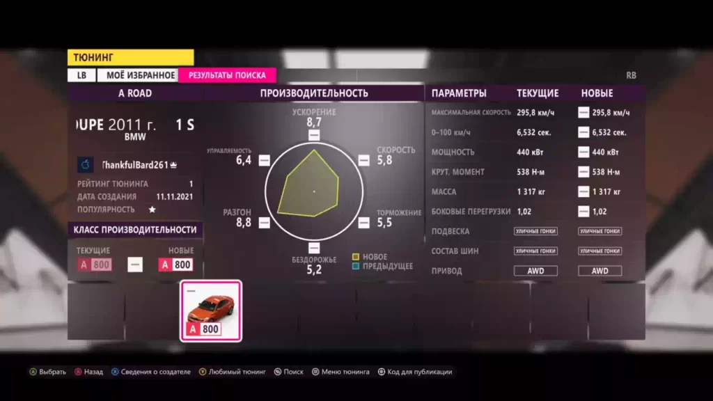 1. Нажав на кнопку Сведения о создателе в окне тюнинга, вы сможете подписаться на автора тюнинга. Теперь взяв любую другую машину и зайдя в окно поиска новых конфигураций тюнинга, авторы, на которых вы подписаны, в том случае, если они сделали тюнинг на данную машину, будут высвечиваться первыми в списке.